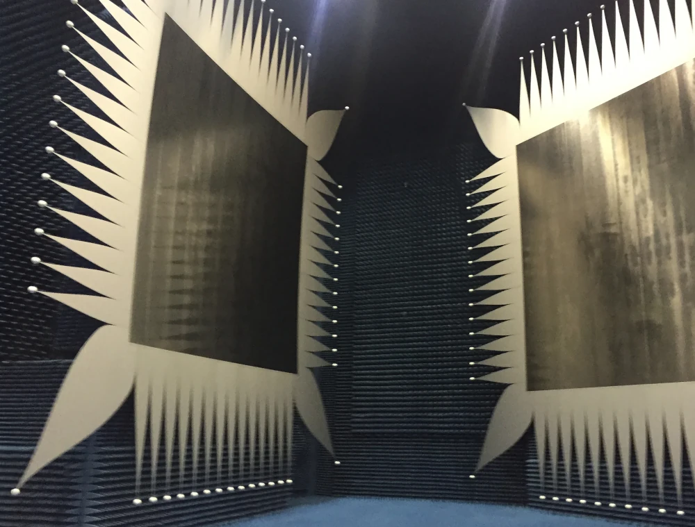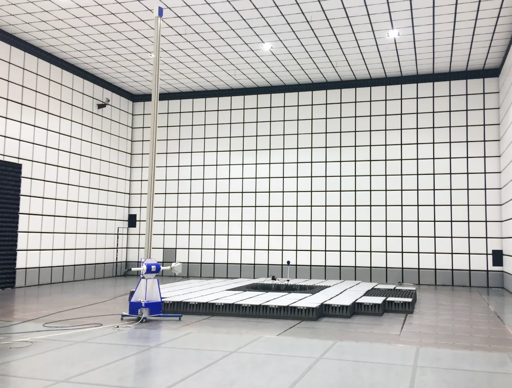 The anechoic chambers allow for emission measurements from 30 MHz to 18 GHz according to CISPR 16-1-4, and immunity testing from 80 MHz to 6 GHz according to IEC/EN 61000-4-3, all performed in fully controlled electromagnetic conditions.